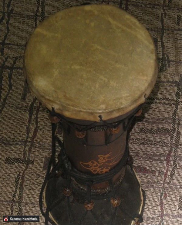 Африканский барабан джембе ручной работы, двухсторонний. Изготовлен из цельного куска дерева и обтянут козьей кожей. Диаметр одной стороны 12,5 см, другой 11,5 см, длина 27 см.