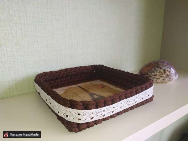 Изготовлена из полиэфирного шнура, который не выцветает и лёгок в уходе. Дно деревянное с рисунком обвязано шнуром, что не позволит ему поцарапать поверхность Вашей мебели.