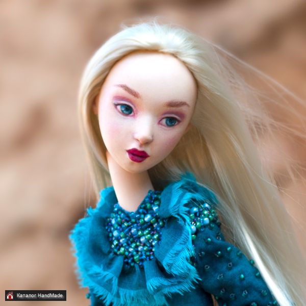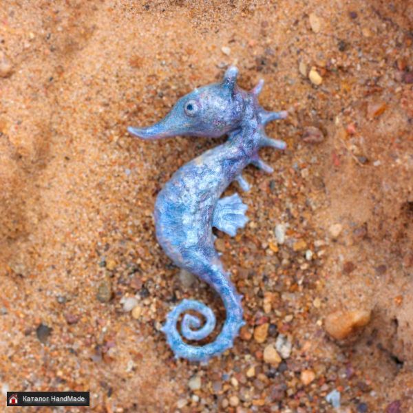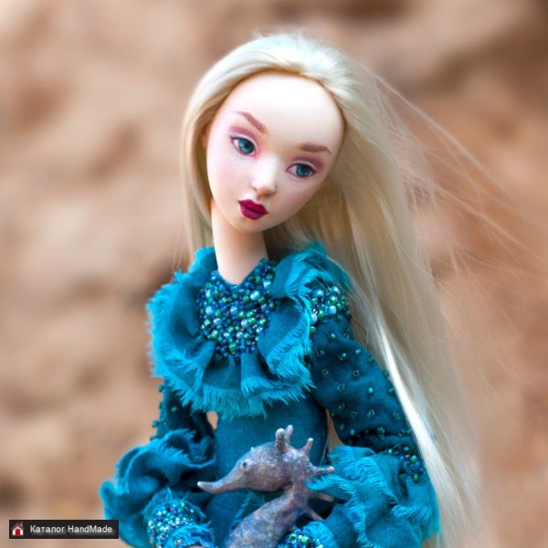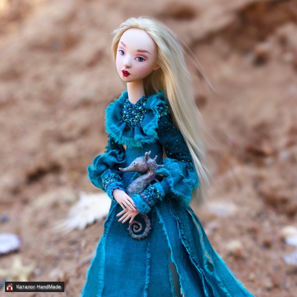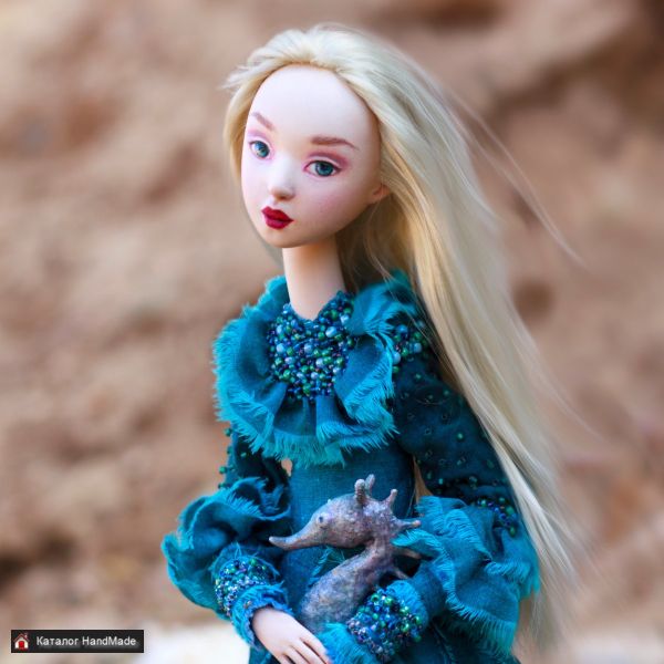 Кукла и морской конек созданы вручную в единственном экземпляре. Роспись акрилом. Голова куклы подвижна. Проволочный каркас, можно изменять положение рук. Стоит без подставки. Платье из хлопка, украшено стеклянным бисером. Рост куклы 30 см. Высота морского конька 7,5 см.