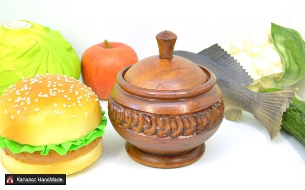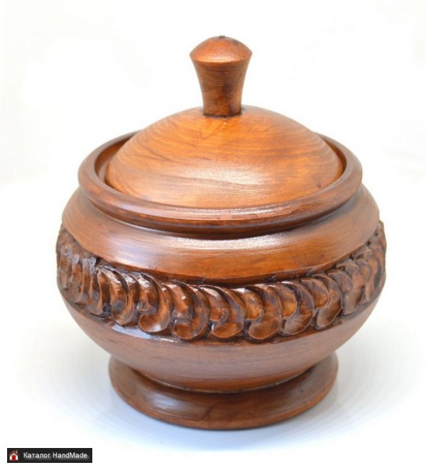 Деревянная банка-кубышка в русском деревенском стиле, по периметру украшена резьбой в виде растительного орнамента. Покрыта антисептическим акриловым лаком коричневого цвета, поэтому банку можно мыть губкой с мылом. Сверху покрыта бесцветным лаком для ограждения от контактов с красителями. Размеры. Высота от дна до пимпочки 11 см, диаметр 9 см