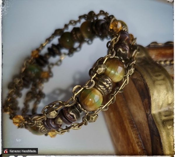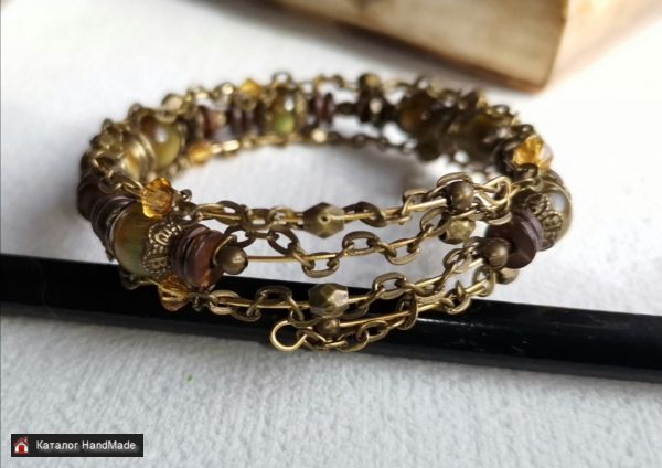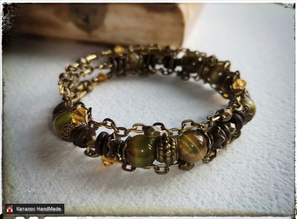 Многорядный браслет ручной работы на мемори-проволоке с бусинами кошачьего глаза. Бронзовая фурнитура. Без застёжки. Подойдёт на руку 15-17см.