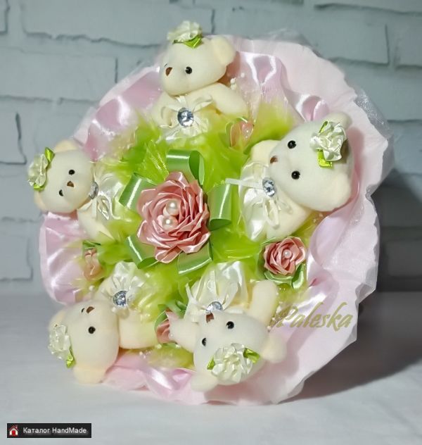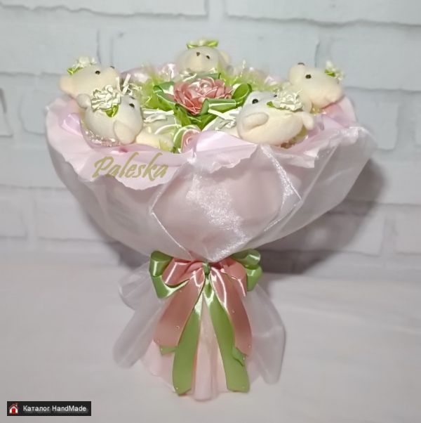 Данной букет состоит: из 5 мишек и 1 розочки из атласной ленты.