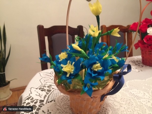Цветы сделаны из гофрированной бумаги, голубого цвета, серединка желтая.Корзинка сплетена из бамбука.Высота 38 см. ,ширина-28 см.Такой букетик долго будет украшать дом.