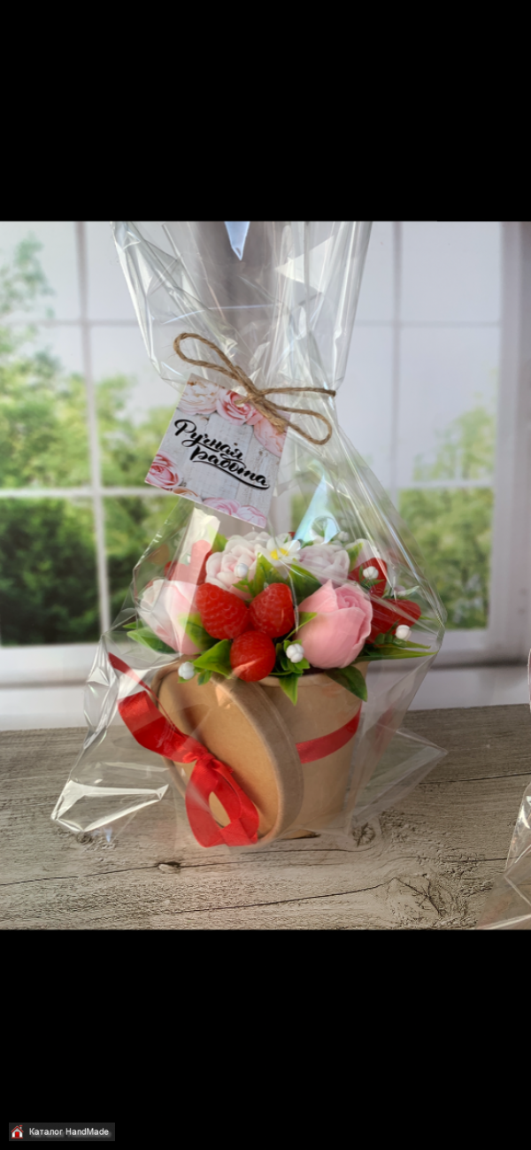 Ягоды, цветы - мыло. Веточки - флористический декор. Размер: Высота: 15 см Диаметр: 15 см Цена: 25 руб Упаковка: пакет с завязкой с биркой Самовывоз около метро Спортивная Действует предзаказ к Дню учителя. Без предоплаты. Забрать можно перед самим Праздником. Повтор подобного более 3-4 дней или в зависимости от загруженности. "Как хранить букет?", чтобы внешний вид сохранился на долгие года: - Избегать попадания жидкости и прямых солнечных лучей. - Храним в сухом защищённом от влаги месте. ( балконы, батареи, холодильник, баню букеты не любят). - Не подвергать воздействию слишком низких или слишком высоких температур (не ниже 0 и не выше +28). - Если все же пришлось нарушить температурный баланс при траспортировке не заносить сразу из холода в тепло и наоборот. Пример: на улице вы несли букет при температуре +35 и выше, занесли домой, а там работает кондиционер и в комнате +20-25 . - Чистку букета от пыли можно осуществлять феном (холодным воздухом сдувать пыль) или кистью с мягким ворсом.