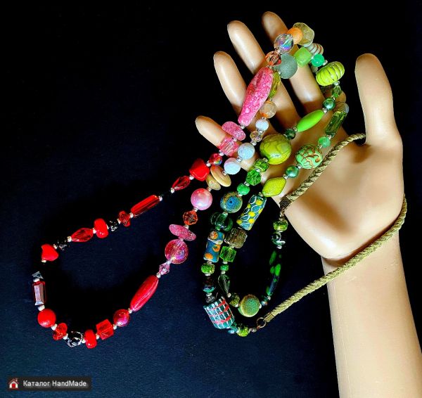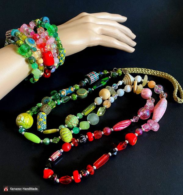 Я работаю без схем и набросков, спонтанно – материалы, лежащие передо мной, сами диктуют и форму, и сочетание цветов, они сами просятся в руки и сами находят себе место в украшении. Бусины как бы чувствуют моё настроение и подыгрывают мне – то желают сложиться в брутальный чокер, то выстраиваются в элегантное колье, а то сплетаются в яркий бесшабашный браслет.