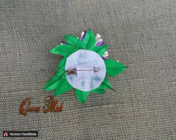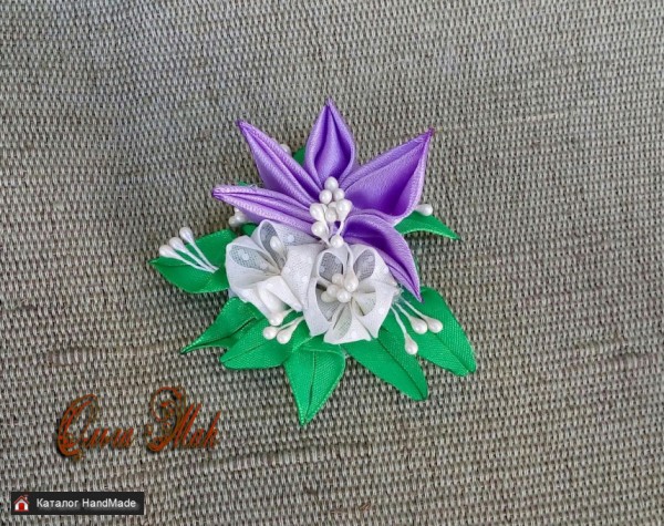 Срок изготовления: Готовая работа Размер: 7х6 см Вес: 20 г Материал: Атласные и органзовые ленты, тычинки Гарантийный срок: Не установлен