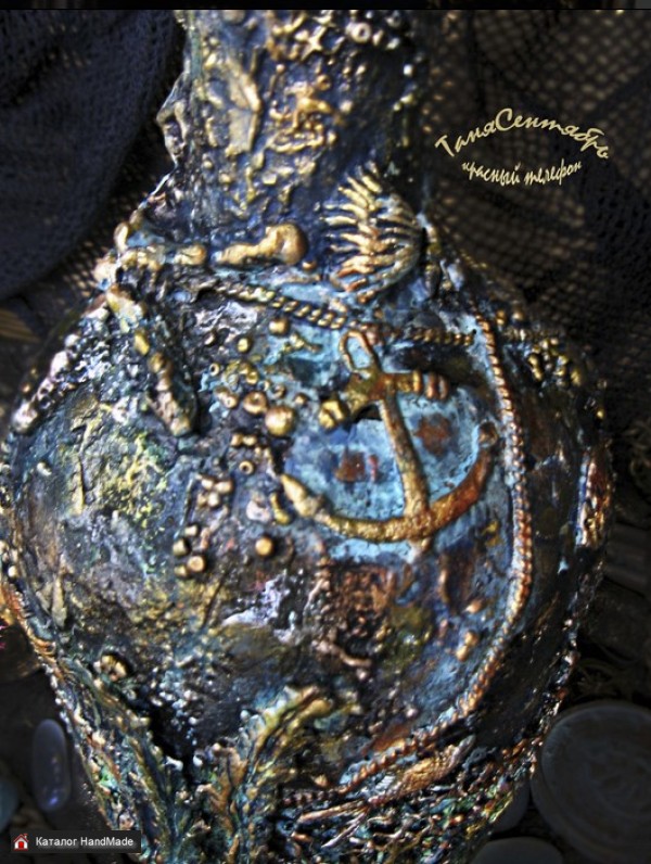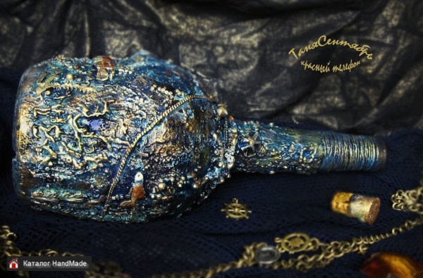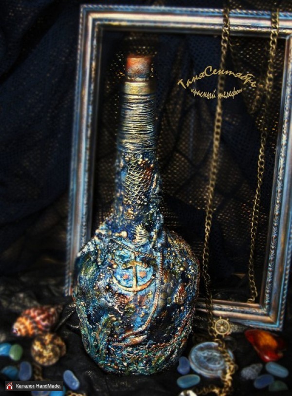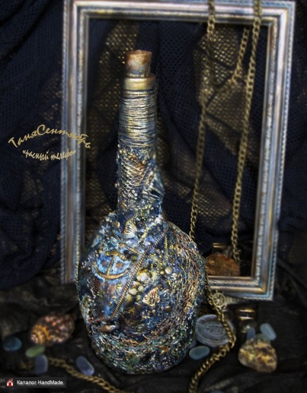 Материалы: стеклянная бутылка, акриловые краски лаки пасты, декораторская глина, металлические элементы, ткань шнур, патины водные, воск финишный, салфетки бумажные, бусины, сетка Размер: диаметр дна - 0к 9,4 см высота с пробкой - ок 29 см