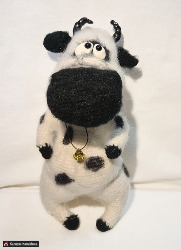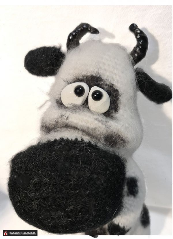 Пряжа, наполнитель синтепух, проволочный каркас, полимерная глина (рожки и глазки)