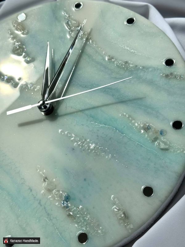 часы в нежном сочетании голубого и белого с серебряным делением и стрелками из зеркального акрила.
