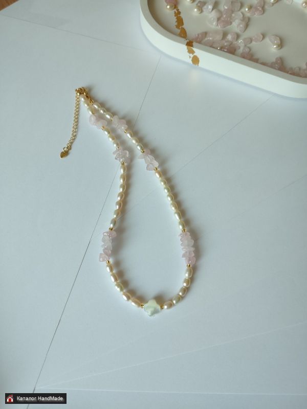 Натуральный жемчуг, розовый кварц, чешский бисер