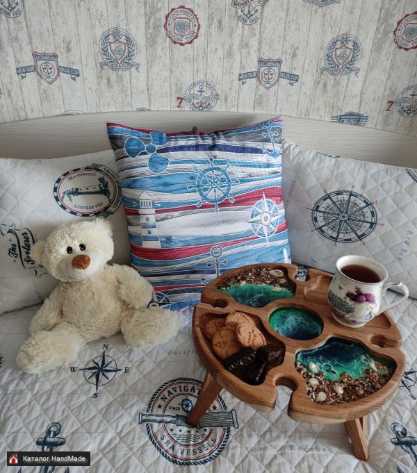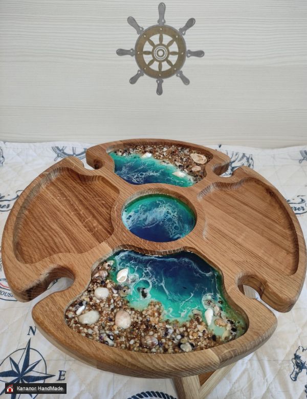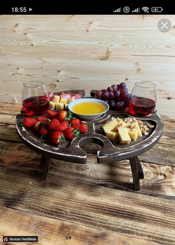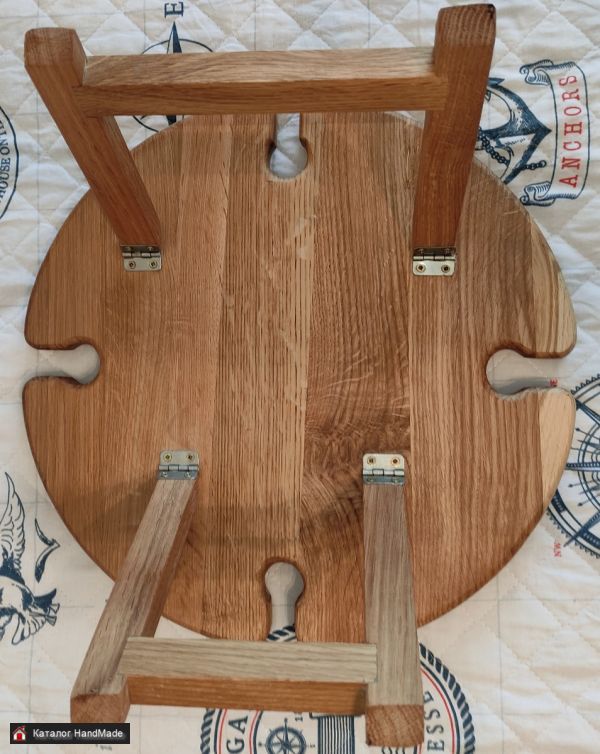 Пропитан столик льняным маслом и пчелиным воском. Диаметр 35 см,ножки складываются.