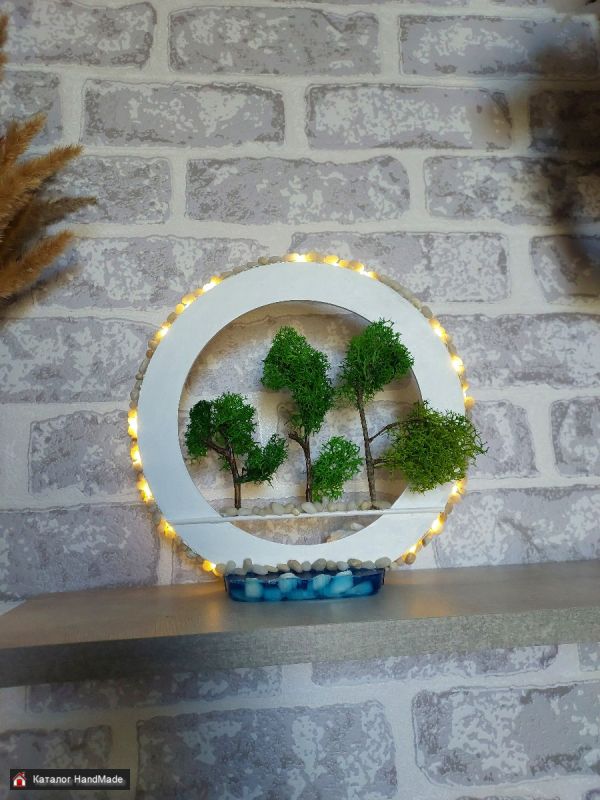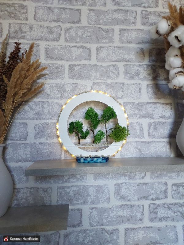 Декор-ночник выполнен из природных материалов, эпоксидной смолы и стабилизированного мха. Оригинальный подарок впишется в любой интерьер. В наличии 2 - чёрный и белый с подсветкой в теплых и холодных тонах.