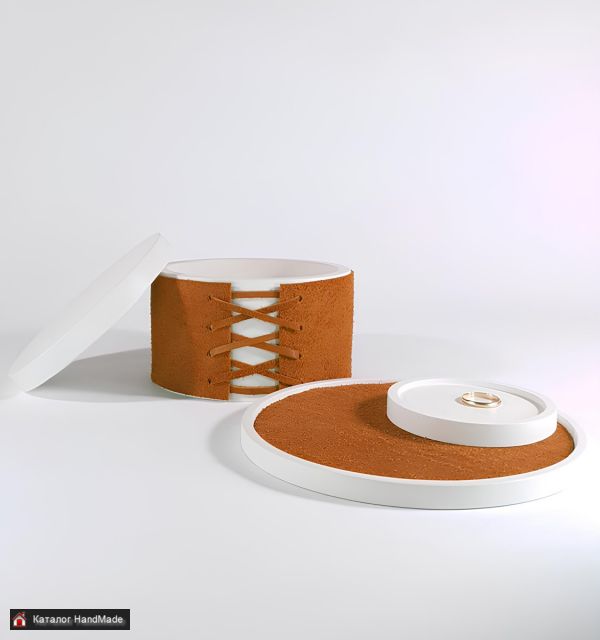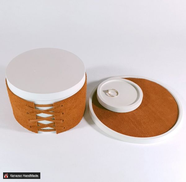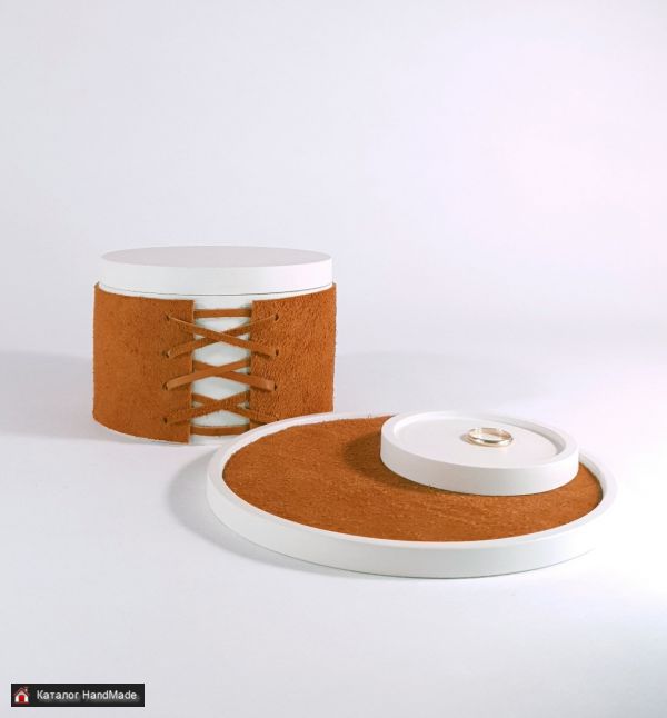 Состоит набор из 3-х предметов: большой шкатулки с крышкой и двух круглых подставок разного размера.