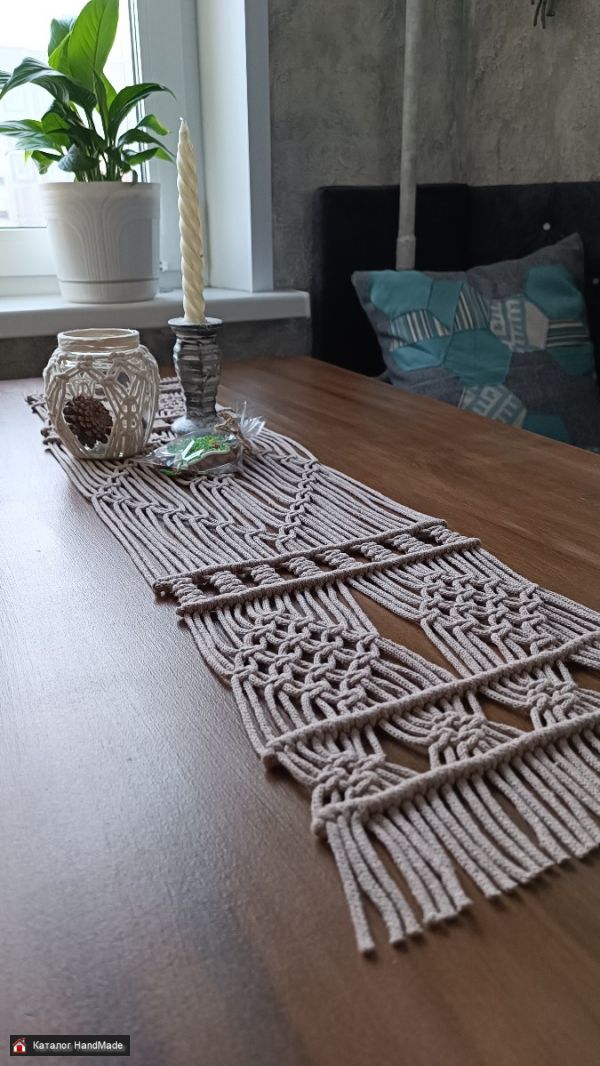 Дорожка на стол в технике макраме украсит любой интерьер. Изготовлена из хлопкового шнура, возможна деликатная стирка, сушить на горизонтальной поверхности. В наличии. Можно изготовить на заказ другой цвет и размер.