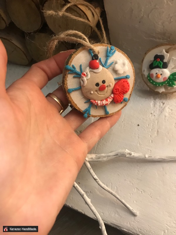 Елочные игрушки на спилах березы с фигурками из полимерной глины. Диаметр около 6см, стоимость за одну игрушку