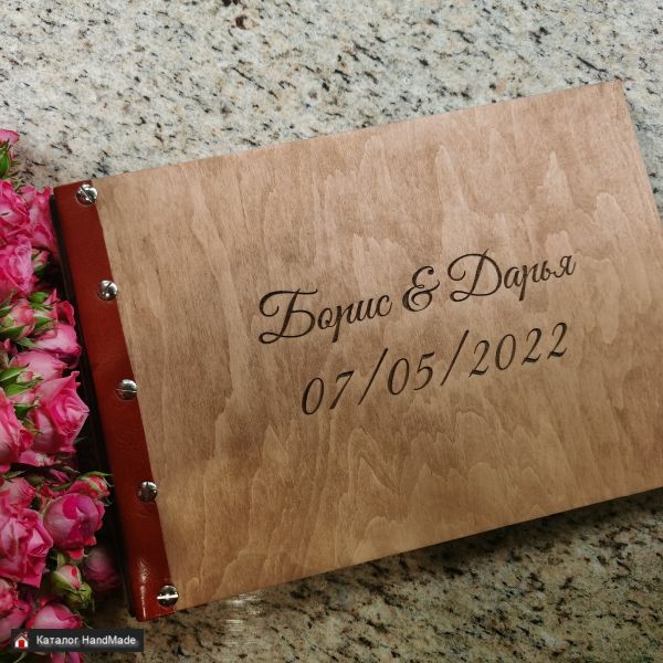 Деревянный фотоальбом ручной работы с корешком из кожи и любым изображением и надписью