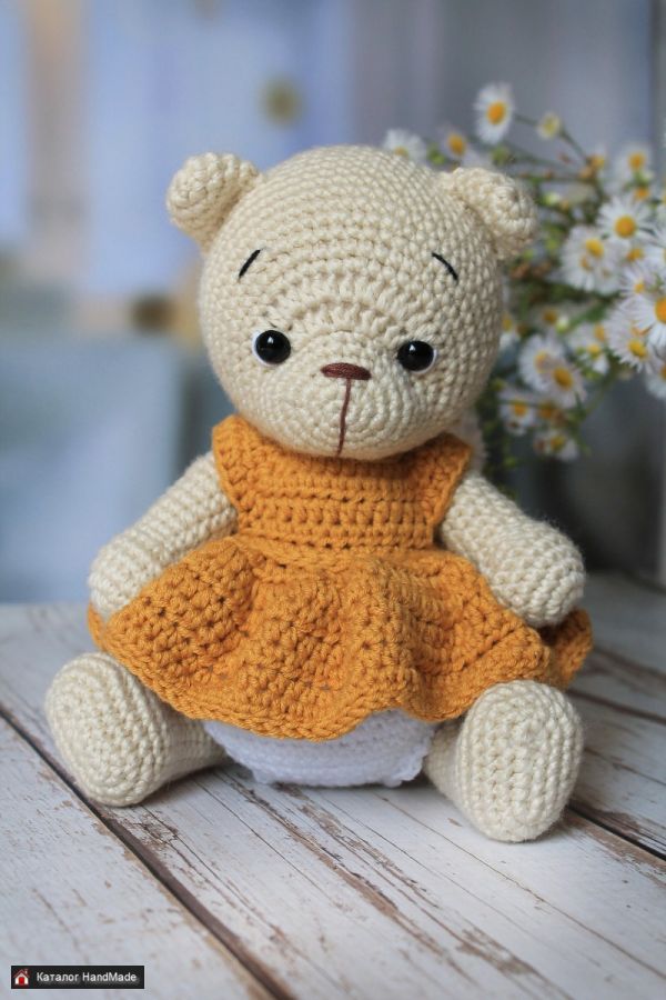 Медвежонок в платье. Платье и трусики снимаются. Сидит самостоятельно. Ручки и ножки подвижные. Ростом примерно 21 см.