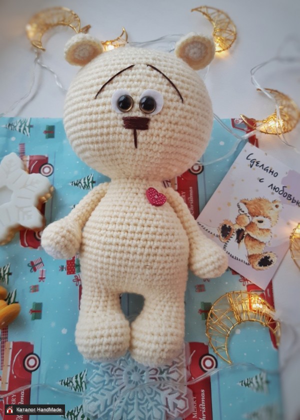 Мишка- Валентин, размер игрушки 33 см. Выполнен из турецкой пряжи, наполнитель холлофайбер, глазки на безопасном крепление, можно стирать