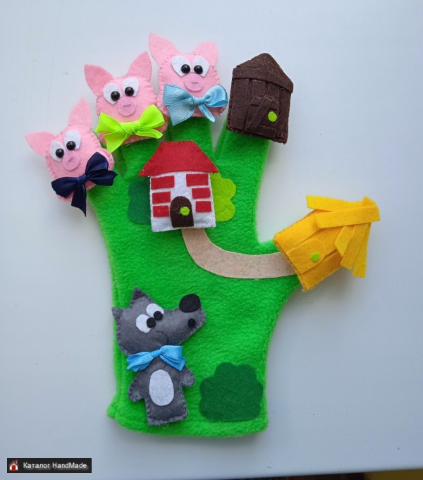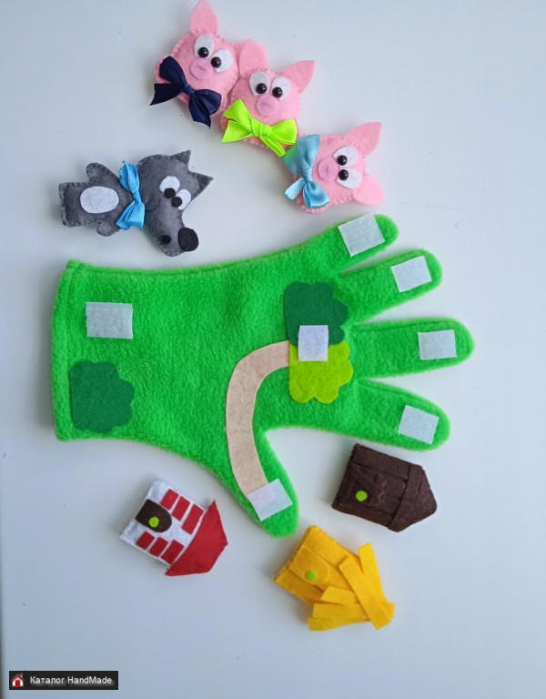 Театр на перчатке три поросёнка. В такой театр дети могут играть самостоятельно или с участием взрослого. Подойдёт для дома и детского сада. Театр делаю на заказ, также могу изготовить сюжет по любой сказке. Цена зависит от сказки.