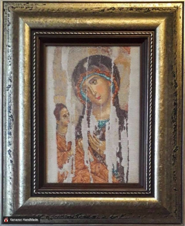 Одигитрия - одна из наиболее распростаненных в православной иконописи типов изображения Богоматери с Младенцем Христом. Вышитая "Богородица" особого,неповторимого дизайна от Thea Gouverneur. Дизайна, повторяющим оригинал, где даже вертикальные потертости полностью совпадают,перед которыми невозможно не остановиться.