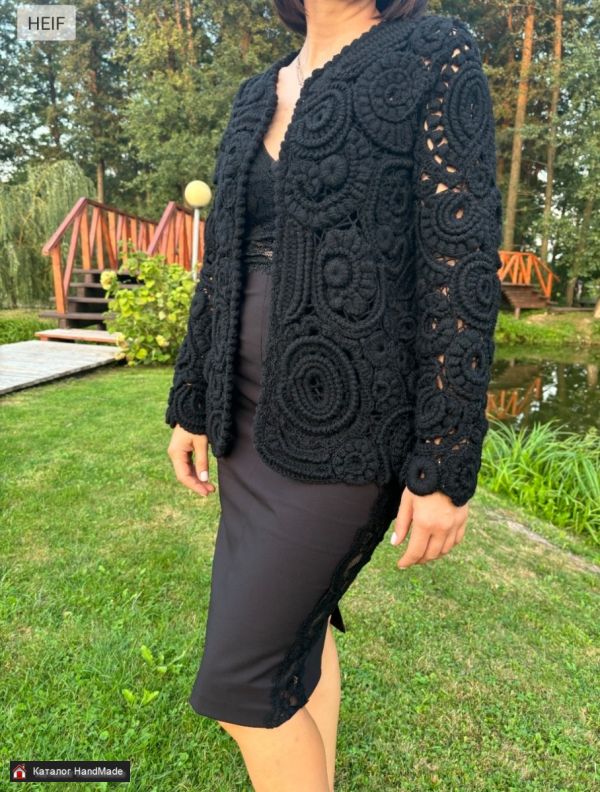 Очень красивый кардиган ,выполнен в технике ирландского кружева,пряжа полушерсть