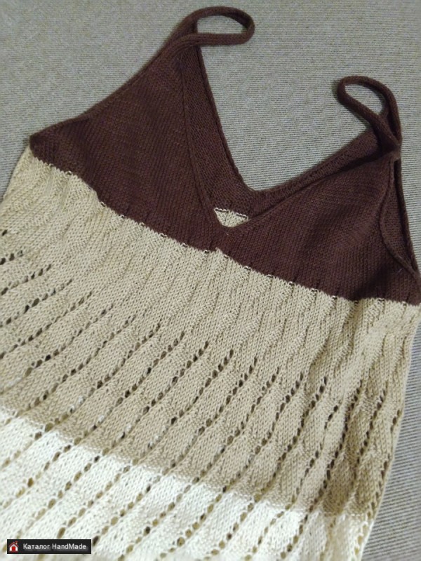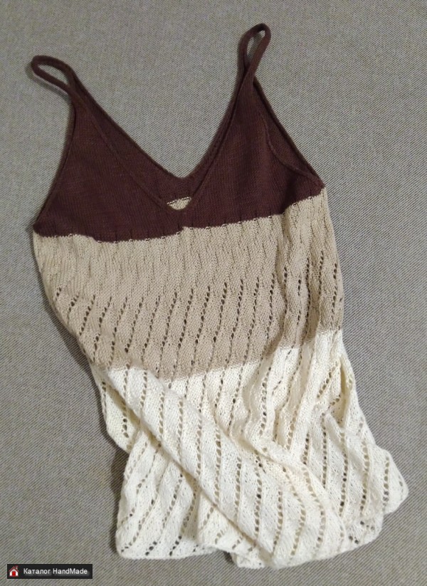 Тонкая, пластичная пряжа, спокойные цвета, сдержанный ажур. Будет хорошо смотреться и с летящей юбкой в городе, и на пляже с шортами. 44-46 р-р
