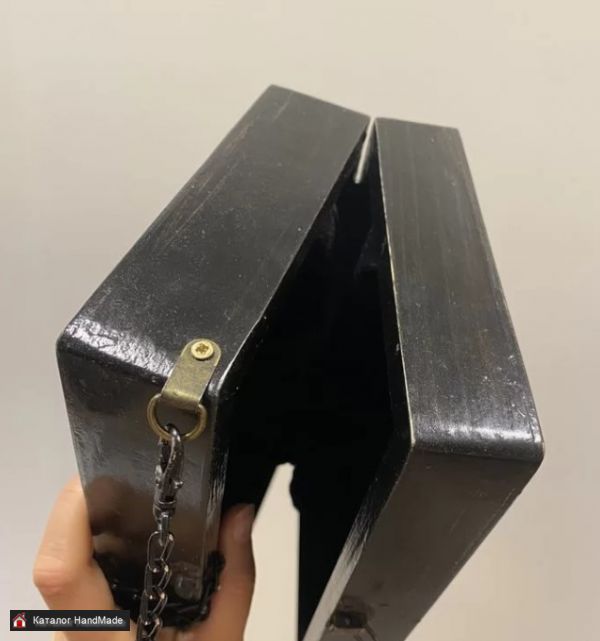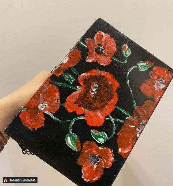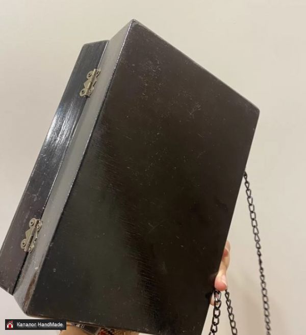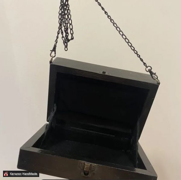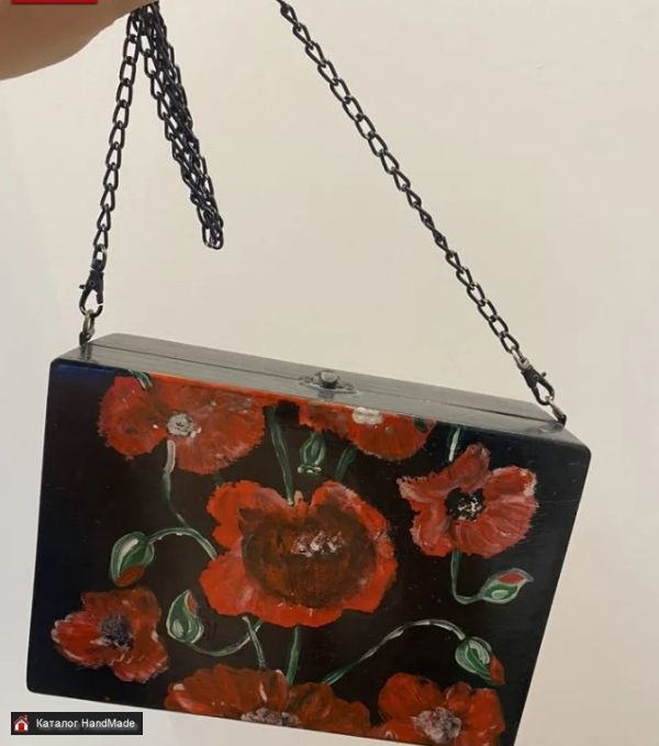 Клатч ручной работы из черного лакированного дерева. С одной стороны, вручную нарисованы красные цветы. Внутри бархатная подкладка. Сумочка подходит для театра или образа. Размеры: 22 на 15, глубина 7.7 см, длина цепочки — 117см. Общий вес сумки 570 гр. Цепочка легкая и снимается.