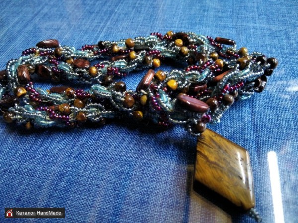 Колье с бусинами и подвеской из тигрового глаза. Длина 60 см, без застежки.