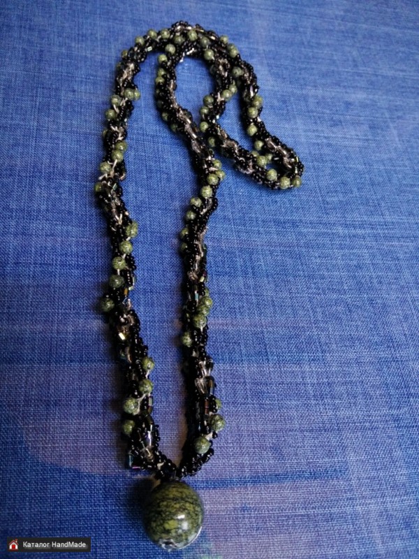 Колье со змеевиком и подвеской из змеевика. Длина 60 см, без застежки.