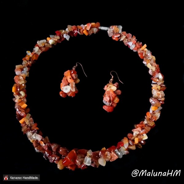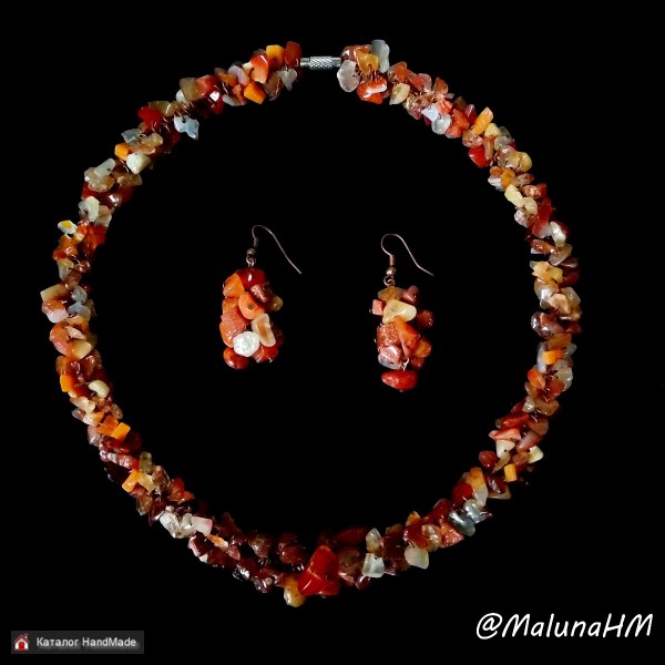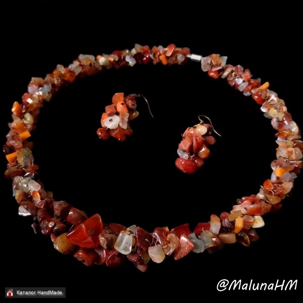 В комплект входят ожерелье и серьги. Набор выполнен из каменной крошки (сердолик, авантюрин, яшма). Цвета камней от молочно-белого до насыщенно-коричневого цвета. Размеры: ожерелье 46 см, серьги 4,5 см. Материалы: натуральные камни (сердолик, авантюрин, яшма), ювелирный тросик, металлическая фурнитура. Условия хранения и использования: беречь от воздействия ударных нагрузок, пыли, влаги и агрессивных сред.