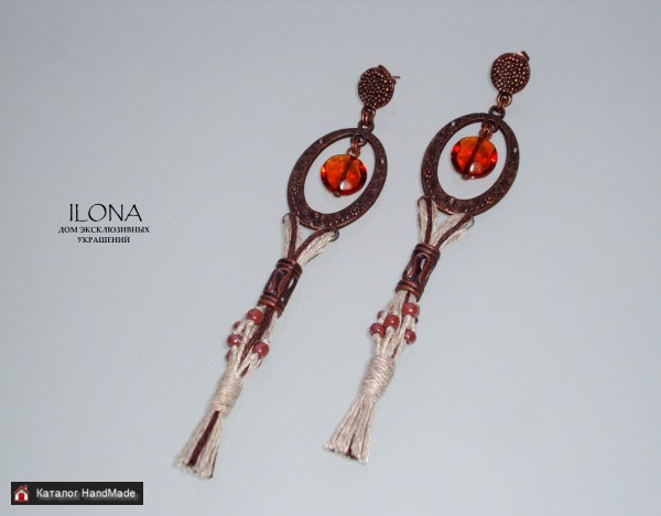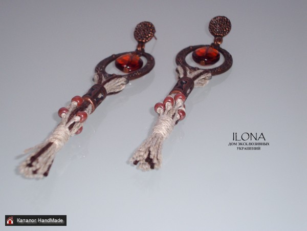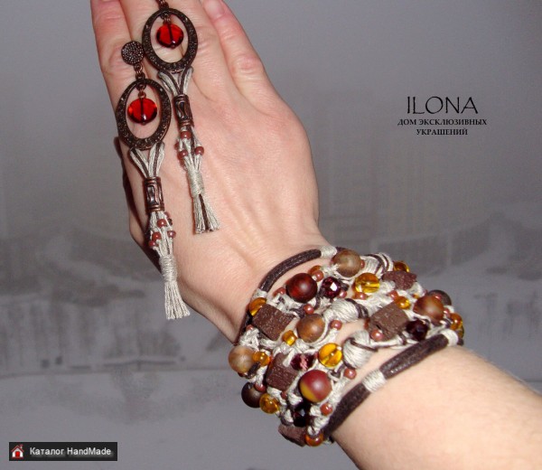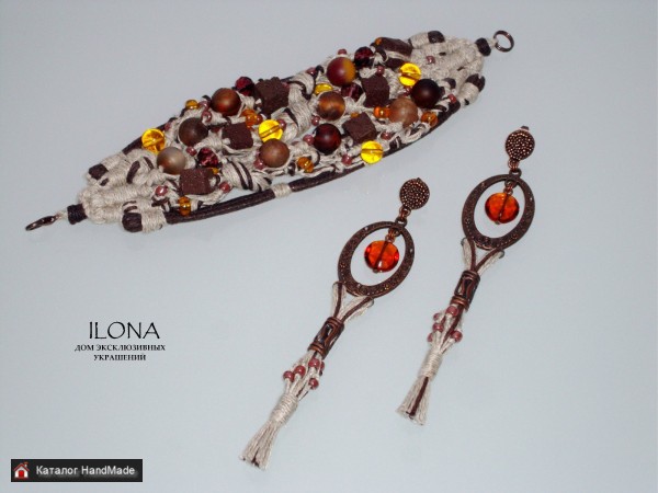 Добрый день! Рада Вас приветствовать! ))) Меня зовут Илона Желобовская. Кто ещё не знаком со мной и моими работами. Я дизайнер и мастер украшений и изделий ручной работы. Представляю "Дом эксклюзивных украшений ILONA" Это украшение -- это такая ода Земле, земной жизни, земной природе каждого из нас -- природе человека. Я вижу коричневую почву, плодородную, густую, плотную, живую, родящую. Зелень, которая выходит из неё, птиц, поющих, сидя на ветке. Вижу людей земных, идущих ногами по Земле, по коричневой плодородной плотной Земле. Вижу земных женщин, природных, дающих Земле людей, мужчин, дающих Земле свою широту. Вижу босые ноги, которые чувствуют собой почву, землю, жизнь, силу, движение, родство. Это такая ода земной любви, земным рукам, земному теплу и земному сердцу. Силу человека и красоту. Материал Серьги: верёвка-шнур, вощёный шнур, гранёное стекло, бисер, металлическая фурнитура. Размер 12 см. Материал Браслет: верёвка-шнур, вощёный шнур, коричневый более толстый шнур, агат, стекло гладкое и гранёное, бисер, квадратики лавы (точное название не скажу). Размер 19 см (при необходимости можно доставить цепочку на удлиненные размера; ширина примерно 6 см. Цена Браслет: 88 рублей. Цена Серьги: 35 рублей Каждое украшение продаётся в коробочке, в которой удобно хранить изделие и приятно дарить! Приглашаю Вас познакомиться с моими другими изделиями в других объявлениях! Так же изготовлю изделие под Ваш индивидуальный заказ! Готов к примерке и приобретению! Смотрите, пожалуйста, все мои объявления, там много красивого для Вас!