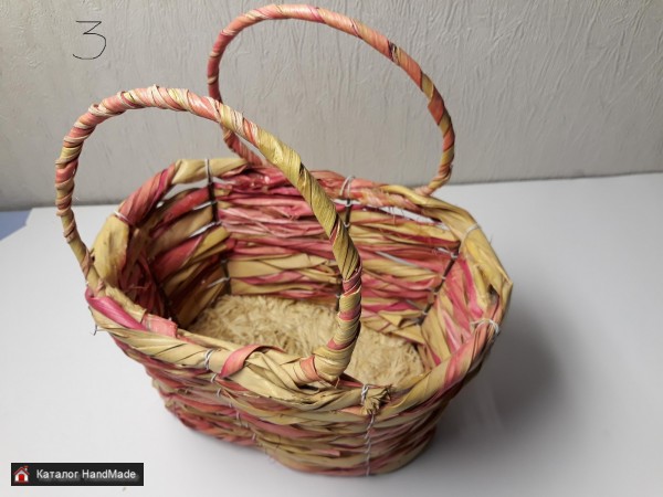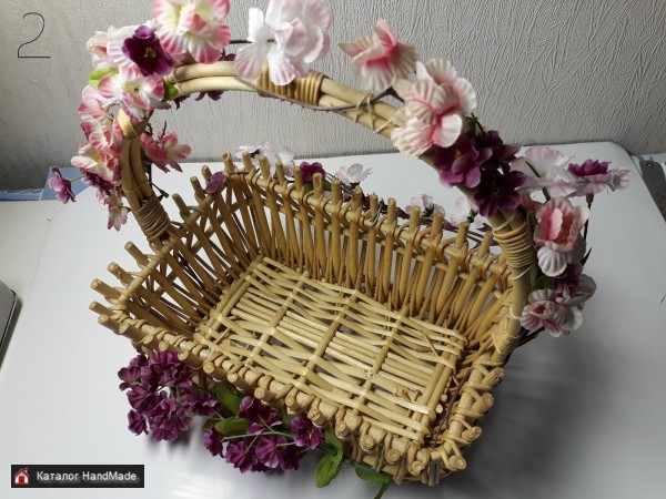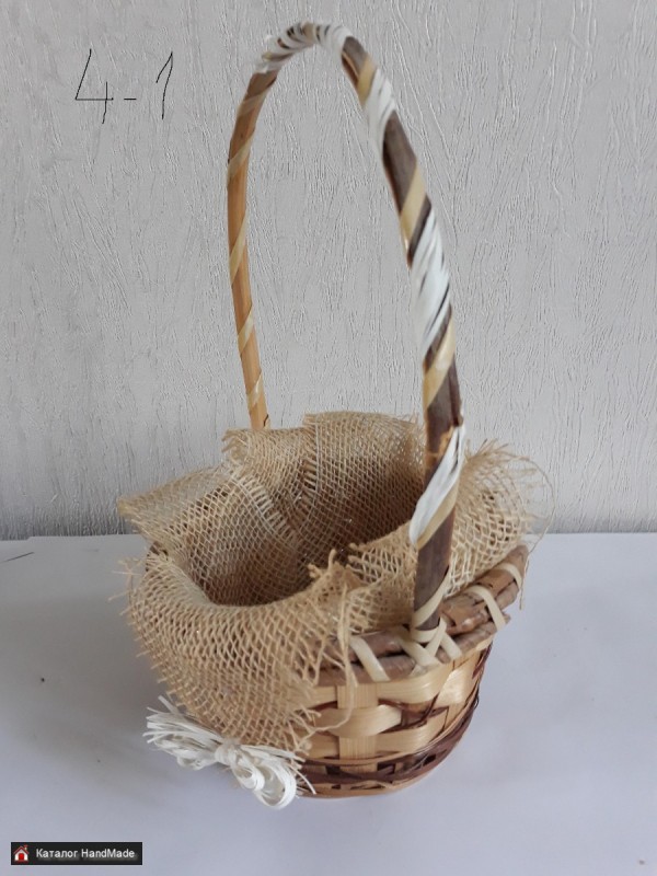 1- овальная плетеная натуральная из прутьев лозы, длина 33 см, ширина 24 см, глубина 17 см, с орнаментом. Цена 20 руб; 2- прямоугольная плетеная натуральная из прутьев лозы, длина 29 см, ширина 19 см, глубина 13 см, с искусственными цветами. Цена 15 руб; 3- малая с натуральными и искусственными элементами, длина 23 см, ширина 16 см, глубина 12,5 см. Цена 5 руб. 4- малая с натуральными и искусственными элементами, диаметр верха 18 см, диаметр низа 12 см, глубина корзины 10 см, высота с ручкой 32 см. Цена 5 руб.