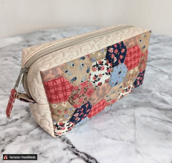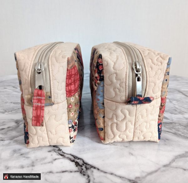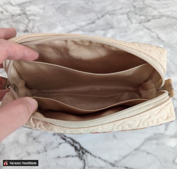 Косметичка простегана на поролоне, мягкая, прочная, хорошо держит форму. Подкладка из сатина бежевого цвета с двумя карманами. Ширина дна может быть 6см или 8см, соответственно стоимость 28 или 30 руб. Можно стирать в стиральной машине.