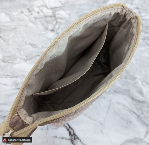 Для верха использовалась бежевая плащевая ткань, для подкладки - бежевый полиэстер. Косметичка простегана на поролоне, мягкая, хорошо держит форму. Узор создается движением ткани руками под иглой швейной машины, поэтому каждый узор уникален! Внутри на подкладке один карман. Ширина вверху 23см, ширина внизу 18см, высота 15см, ширина дна 6см. Можно стирать в стиральной машине.