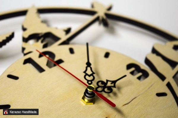 Представляют из себя круглые настенные часы из дерева, диаметром 30 см. Толщина в 6 мм придаёт часам объемный вид на стене, и удачно вписывает их в любой интерьер. С обратной стороны, все элементы имеют петли для крепления на стену. Часы имеют бесшумный кварцевый механизм плавного хода.