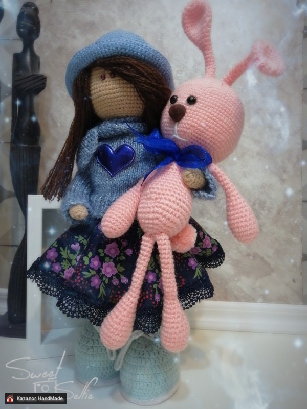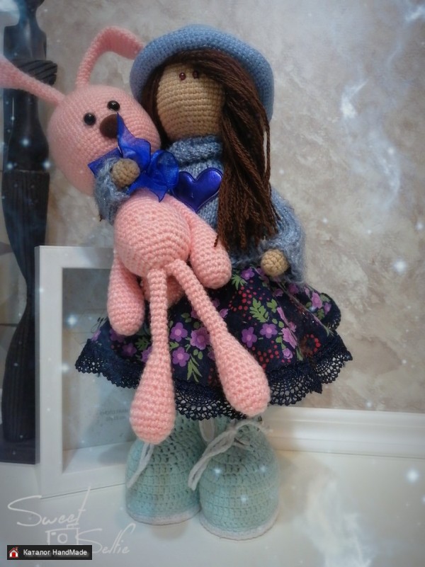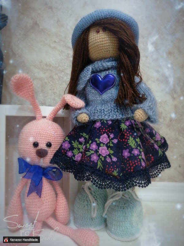 Кукла ручной работы выполнена из качественных материалов. Рост 35 см. Стоит самостоятельно за счет обуви,вся одежда снимается,ручки сгибаются. Кукла идет в комплекте с игрушкой аксессуаром зайка. Ручная работа всегда ценится за свою эксклюзивность. Приобретая изделия handmade вы можете быть уверены на все 100% , что вы единственный владелец и другой такой вещи не больше ни у кого. Даже сам мастер не сможет на 100% повторить свою работу. Такая кукла станет незабываемым подарком .