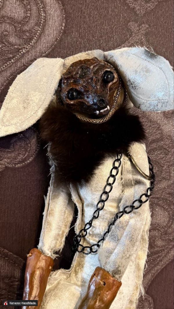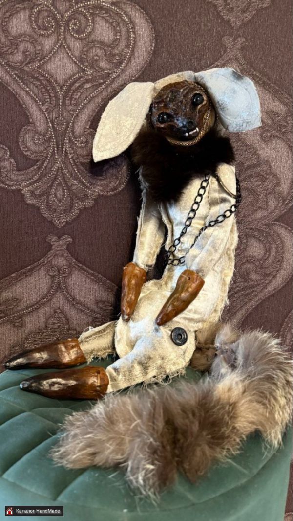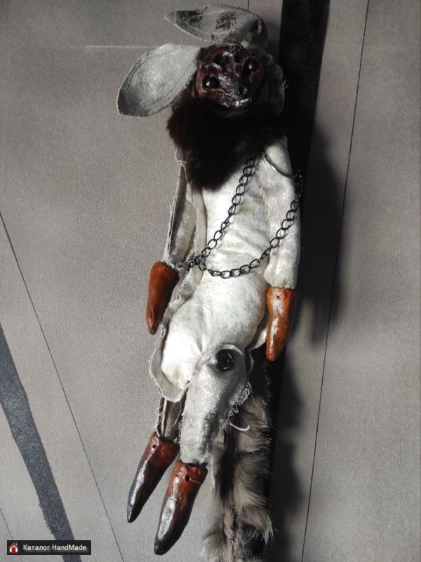 Эта кукла сшита мной, по неистерпимому желанию создать нечто эстетично-страшное и вместе с тем мило-мягкое в небрежном стиле. Швы куклы открыты и умеренно осыпаются, маска и лапы сделаны из необожжённой голубой глины, покрыты акрилом и матовым лаком. В высоту кукла примерно 60-65см. Красиво смотрится вися на стене (для крепления есть специальное колечко на, скажем так затылке) намеренно неаккуратно сшитый хвост свисает ещё сантиметров на 25 что в целом при рассмотрении в полумраке придаёт кукле визуальную схожесть с чучелом неправильно сшитой Чупакабры. Могу Отослать почтой по Беларуси или Самовывоз с Ул. Люцинская или с ул. Шафаранянская. Могу попробовать сотворить что то на заказ специально для вас.