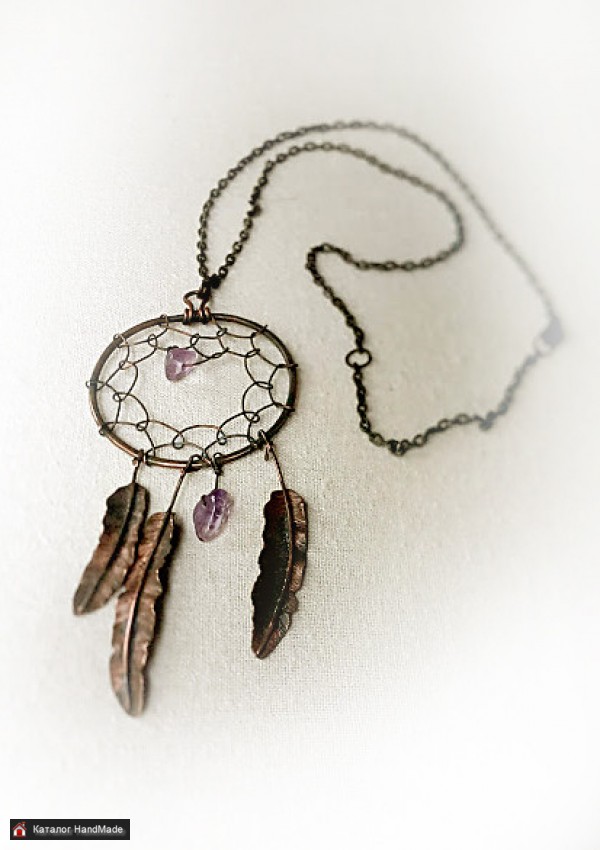 Кулон "Ловец снов" выполнен из меди в технике wire art, в стиле бохо с бусинами из натурального камня аметрина. Медь патинирована и отполирована. Каждое перышко выполнено вручную. Изделие уникально и является авторской ручной работой. Размеры: кулон- 5х10,5 см цепочка - 22,5 см + удлинитель 9 см. Уход: не гнуть, не ронять; не наносить косметику после надевания аксессуара, не подвергать химическому воздействию. Хранить рекомендовано в пакетах (коробочках) по-отдельности. Время от времени полировать жестким материалом (кусочек джинсовой ткани). Носить с удовольствием! С вопросами о доставке обращайтесь по телефону Автор является зарегистрированным ремесленником.