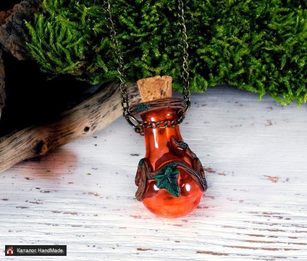 Материалы: стекло, полимерная глина, краски, лак Размер: 2.5х1.8 см. без учета пробки длина цепочки 50 см.