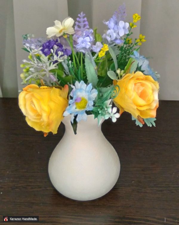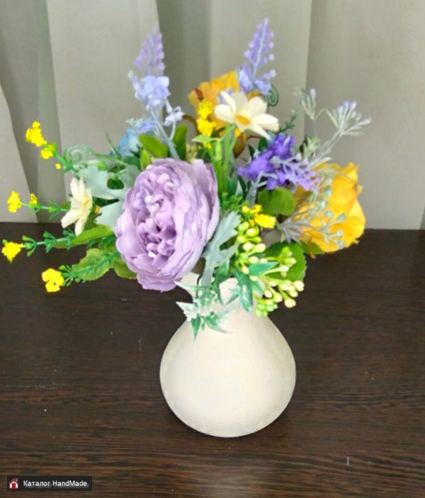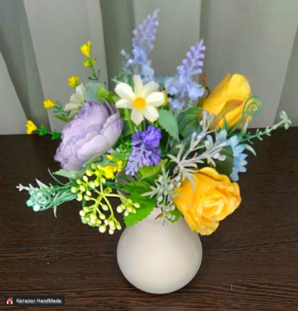 Цветочная композиция ручной работы - это оригинальное украшение интерьера в любом стиле. Букетик прост в уходе, не завянет и будет радовать вас своими позитивными красками и в пасмурный день.