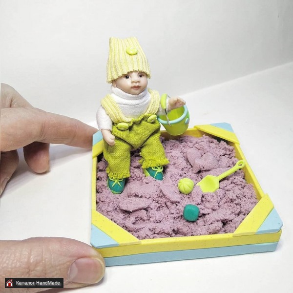 Малыш имеет два комплекта одежды, ведёрко, лопатку и две формочки.