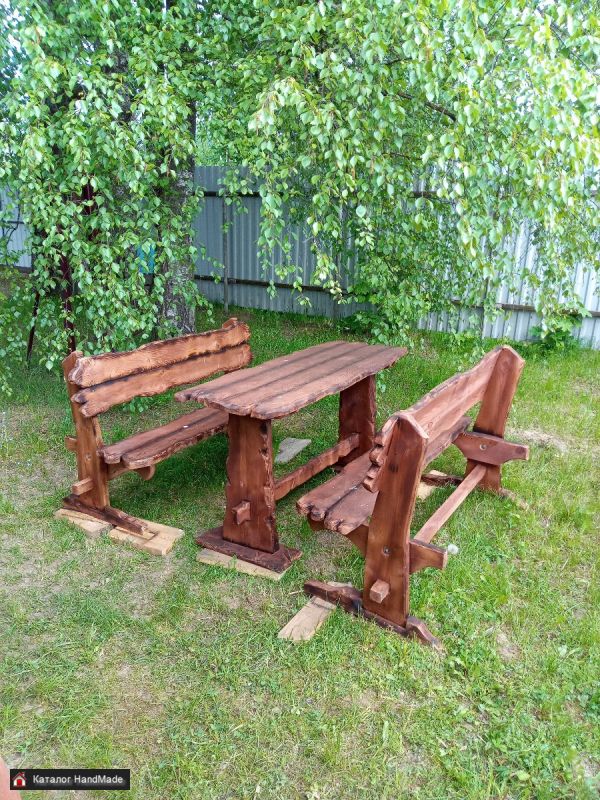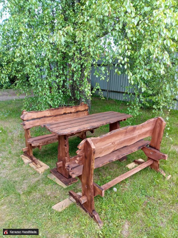 Обеденный стол (длинна 1м50см,высота 80см) и две скамейки(длинна 1м50см,высота 90см). Материал сосна, обжиг, пропитан.