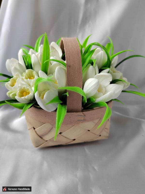 Первые весенние цветы, подснежники, напоминают, весна пришла. В букете 15 мыльных цветков подснежника. Букет оформлен в корзинке. Высота без ручки 10 см, ширина шапки 15 см, высота с ручкой 12 см. Аромат "тюльпан",запах весны. Упаковывается в прозрачный пакет.