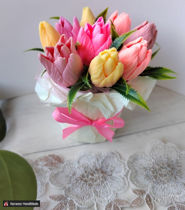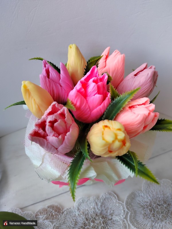 Порадуйте своих близких оригинальным букетом. Мыльный букет будет долгое время радовать ваших родных. Букет состоит из 9 тюльпанов, аромат "сакура". Упаковка прозрачный пакет с лентой. Высота 13 см. Самовывоз район Уручье. Можно изготовить букет по вашему желанию.