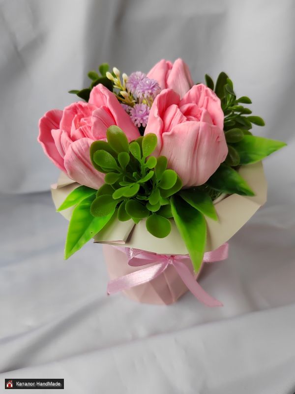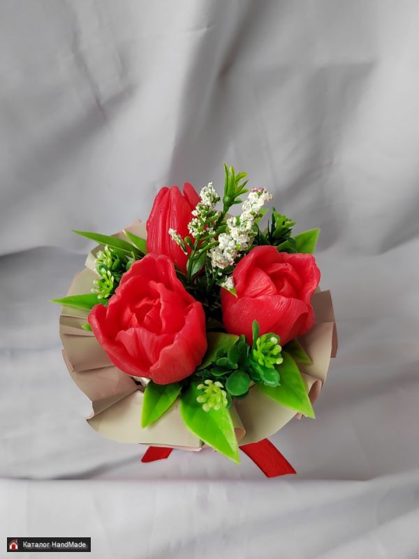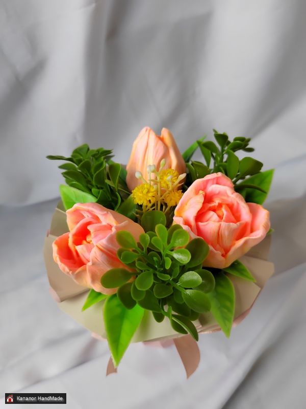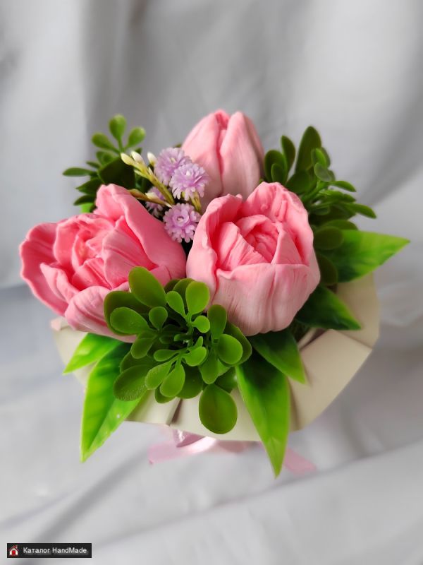 Милый букет-комплимент из 3 тюльпанов. Этот букет напомнит о приходе весны. Букет высотой 12 см, ширина по шапке 11 см. Аромат «Тюльпан». Упаковка: прозрачный пакет с лентой.