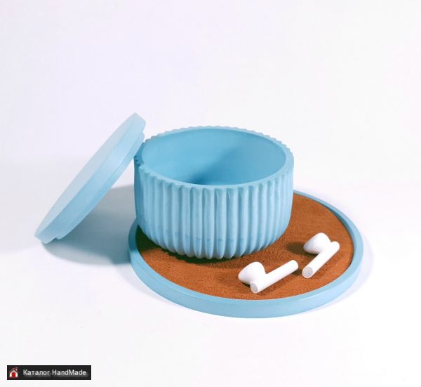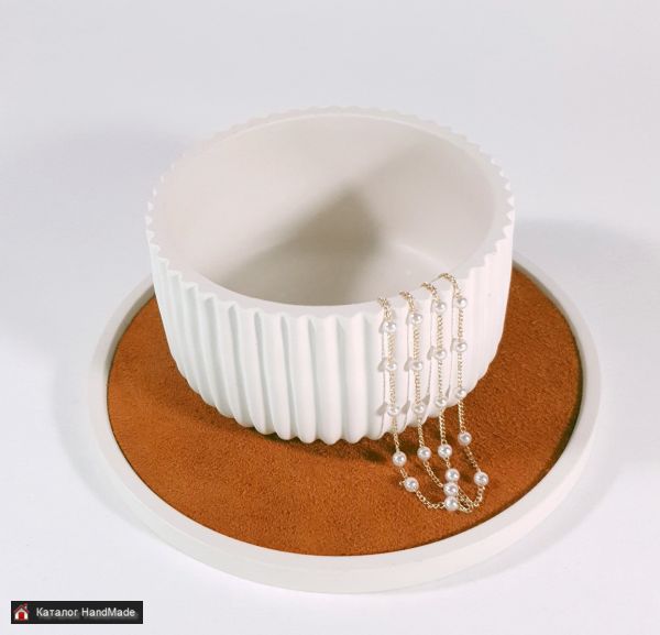 Состоит набор из 2-х предметов: шкатулки рифленой с крышкой и круглой подставки с вставкой из кожи.