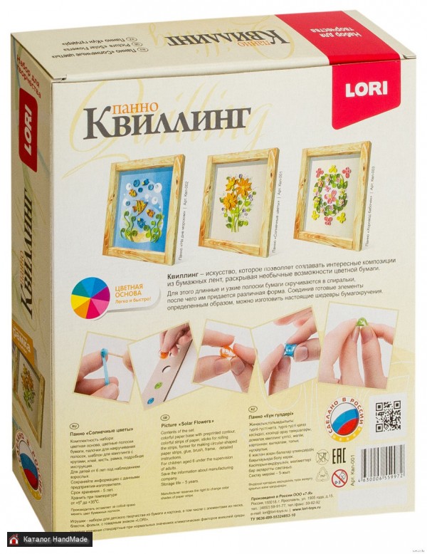 Оригинальный набор для творчества, позволяющий создать яркое панно из цветных полосок бумаги. Квиллинг - искусство, которое позволяет создавать интересные композиции из бумажных лент, раскрывая необычные возможности цветной бумаги. Для этого длинные и узкие полоски бумаги скручиваются в спиральки, после чего им придается различная форма. Соединив готовые элементы определенным образом, можно изготовить настоящие шедевры бумагокручения. Производитель Lori Сложность Для всех Возрастные ограничения 6+ Упаковка Коробка Размер упаковки 230х200х20 мм Артикул Квл-001 Вес 127 г Состав Цветная основа Полоски разноцветной бумаги Шаблон для квиллинга Палочки для накручивания полосок Клей Кисть Рамка Инструкция
