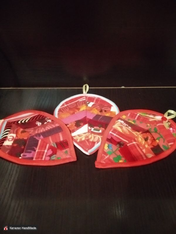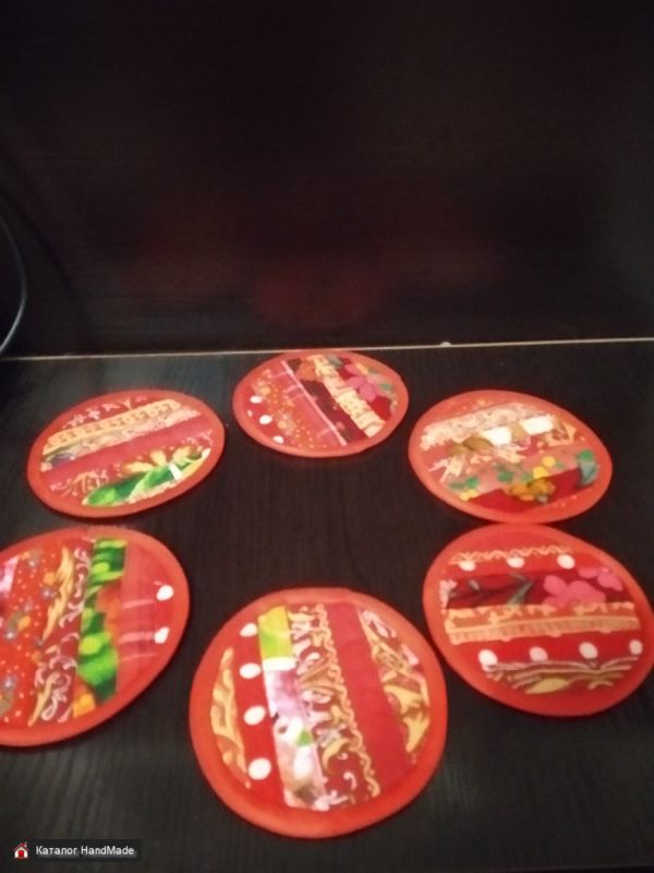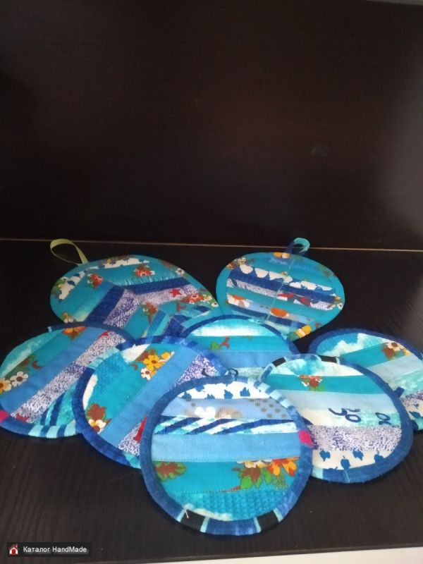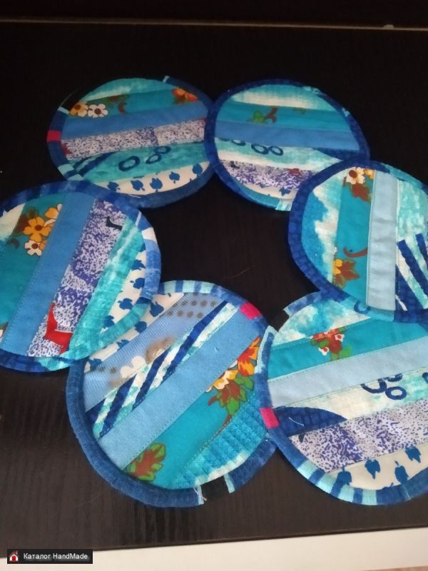 Набор из 6 костеров (подставок под кружки, чашки и стаканы) и прихватки в стиле пэчворк. Практичные и красивые подставки - полезный аксессуар в каждом доме, а также в кафе или баре. Подставка под кружки защитит поверхность стола от пятен и царапин. А прихватки необходимая вещь на каждой кухне.