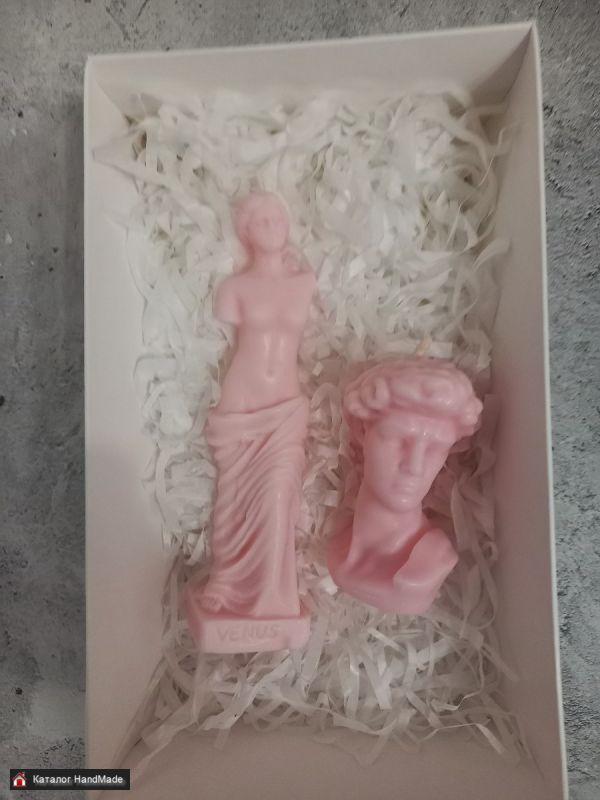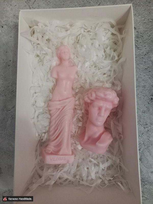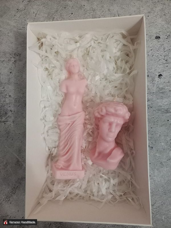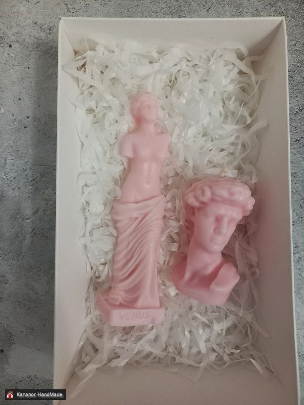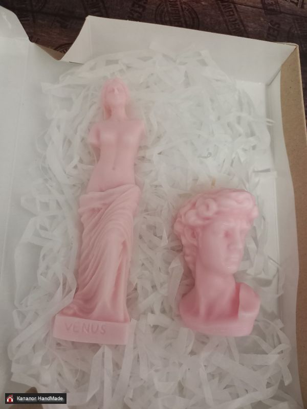 Набор свечей "Венера и Давид" ручная работа. Цена за всё, вместе с упаковкой. Высота свечи "Венеры" 13,5 см, вес 55 г, высота свечи "Давид" 7,5 см, ширина 4,2 см, вес 60 г. Красивый и оригинальный сувенир, а также украшение вашего интеръера!