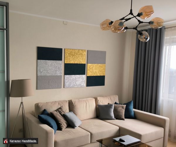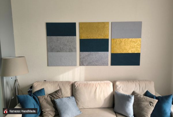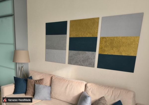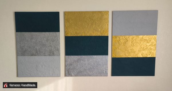 Декоративное панно. Триптих (состоит из 3-х отдельный панно). Цвета: золото, серебро, темно синий, серый. Объемный, рельефный фон. Авторская работа. Размеры: 3 панно по 60*90 см. Общий размер (по стене): 180 * 90 см.